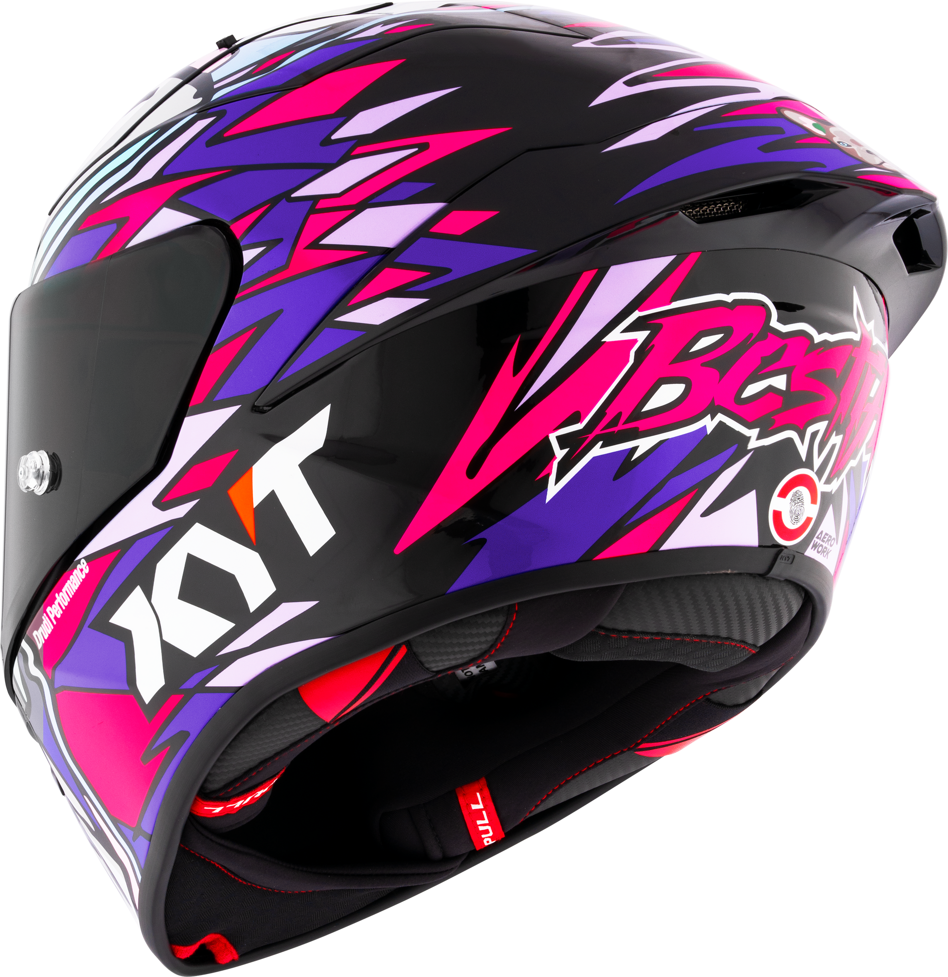 - Il sistema di ritenzione a doppio D-Ring garantisce una tenuta sicura del casco, anche durante manovre estreme in gara.